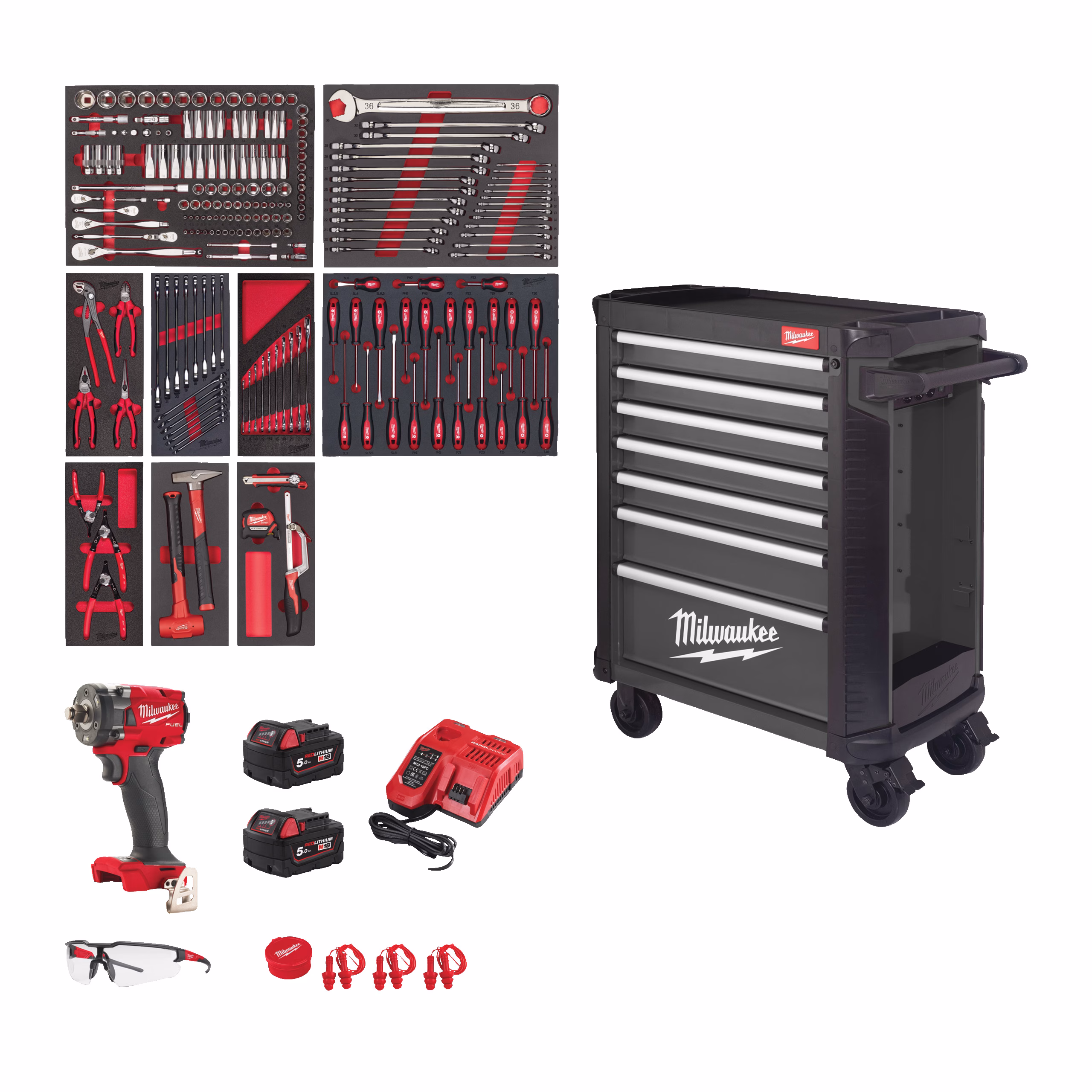 Set di 194 pezzi con chiavi a cricchetto e bussole da 1/4“, 3/8” e 1/2″ in inserto di schiuma, set di 27 chiavi combinate MAXBITE in inserto di schiuma, set di 4 pinze in inserto di schiuma, set di 15 chiavi a bussola con cricchetto MAXBITE in inserto di schiuma, set di 10 chiavi a doppia apertura in inserto di schiuma, set di 23 cacciaviti trilobati in inserto di schiuma, Set di 3 pinze per anelli di sicurezza in inserto di schiuma, Set di 2 martelli in inserto di schiuma, Set di 3 utensili da taglio e misurazione in inserto di schiuma, Set di 32 bussole a percussione Shockwave™ da 1/2 pollice in inserto di schiuma, M18FIW2F12-0 avvitatore a impatto compatto da 1/2 pollice, 2 batterie M18™ resistenti agli agenti chimici da 5.0 Ah, caricabatterie rapido M12™ e M18™, occhiali protettivi antigraffio, 3 tappi auricolari riutilizzabili, carrello da officina TOOLGUARD™ da 30 pollici